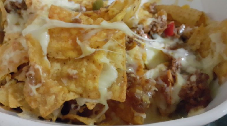 4. Bila dah sejuk letakkan lauk tersebut dalam mangkuk. Lepastu lapiskan dengan cheese, kemudian nachos dan selang seli je dengan lauk, nachos dan akhir sekali cheese.