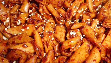 5. Lipat/simpul dengan kulit popia. Sekiranya lipat gunakan tepung gandum yang dicampur dengan sedikit air sebagai gam untuk melekatkan kulit popia