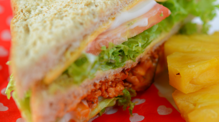 - Hias roti sandwic dengan kepingan keju, mayones, salad, timun jepun, inti ayam, dan tomato. Kepitkan dengan roti dan sedia dimakan.