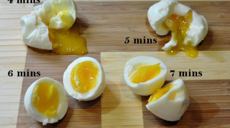 Place eggs in pot of cold water and bring the water to a boil. Immediately turn off the heat. Let the eggs sit in the water for the allotted time then move them to a bowl with cold water for 2 minutes.
